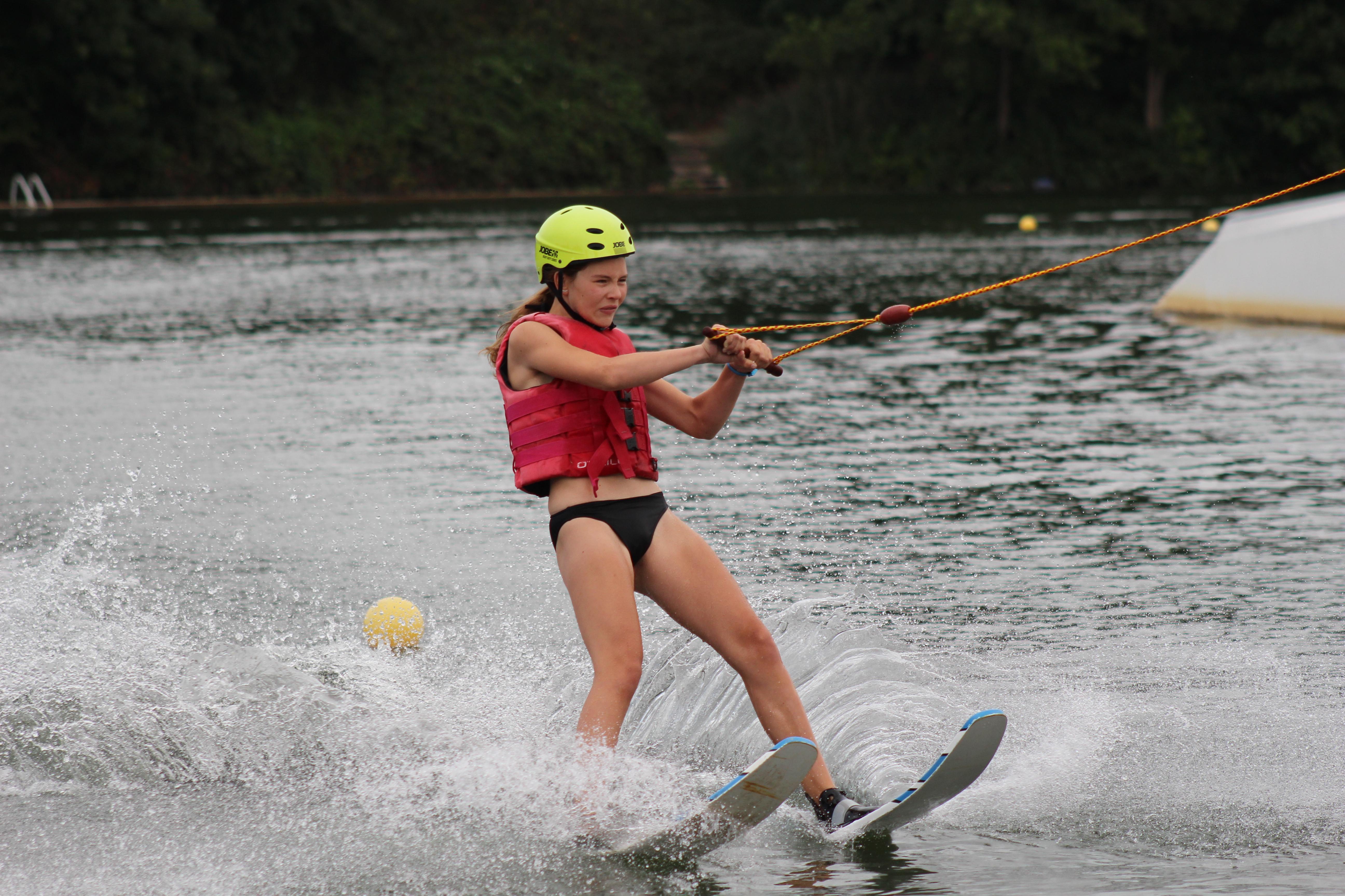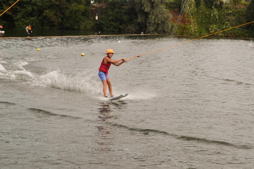 Een van de inbegrepen activiteiten is waterskiën. Op een prachtig meer nemen we je mee naar een kabelbaan waar je rondes kunt maken op het water. Heb je nog nooit gewaterskied? Geen probleem! Begin met een kneeboard, waarbij je op je knieën het water over glijdt en de bochten leert nemen.